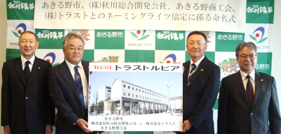 あきる野市の複合施設「あきる野ルピア」(同市秋川)の愛称が1日から「トラストルピア」になった。6日には同市、秋川総合開発公社、あきる野商工会と、同市二宮東の健康食品関連会社「トラスト」(熊澤俊典社長)とのネーミングライツ協定に係る命名式が同施設で行われた。「トラスト」は1983(昭和58)年に設立し、健康食品の顆粒、錠剤、カプセル等の乾燥原料の受託包装を手がけている |