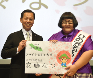 日の出町合併70周年町制施行50周年記念式典が13日、イオンモール日の出のイオンシネマで行われ、来賓含む約215人が参加した。お笑い芸人「安藤なつさん(メイプル超合金)が日の出町ふるさと大使第一号として就任し、就任式も行われた。1955(昭和30)年に大久野村と平井村が合併し日の出村が誕生。1974(昭和49)年に日の出町となった