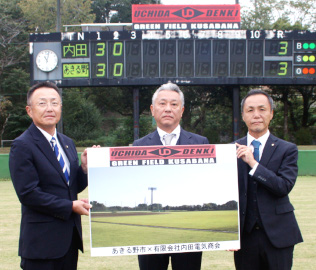 あきる野市と有限会社内田電気商会(佐藤慶社長、同市草花)はこのほど、「あきる野市球場」(同市原小宮)のネーミングライツに関する協定を締結。1日から同球場の愛称が「内田電気商会グリーンフィールド草花」になり、14日に命名式が行われた。市が募集した同球場のネーミングライツ・パートナーに内田電気商会が応募し、8月21日に協定を結んだ。期間は10月1日から2030(令和12)年9月30日までの5年間。命名権料は年額100万円で、施設管理に活用される