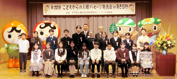 多摩西人権擁護委員会協議会主催の「第22回こどもからの人権メッセージ発表会inあきる野」(森田康大実行委員長、石川好男副実行委員長)が12月13日、あきる野市の五日市地域交流センター3階まほろばホールで開かれ、あきる野市をはじめ、西多摩8市町村の小学生が「人権の大切さ・素晴らしさ」をテーマに、日常生活の中での気づきや体験を発表。また、ゲストとして「令和7年度全国中学生人権作文コンテスト東京都大会」に応募した西多摩の中学生が作文を発表した。人権メッセージ発表では、あきる野市立屋城小5年の井上瑞稀さんと同市立五日市小6年の松木寿乃介さんが司会を務め、小学生10人がジェンダーや戦争、言葉、いじめ、病気、人権そのものなど、さまざまなテーマについて伝えたい思いを発表。中学生7人による堂々とした人権作文発表にもあたたかい拍手が送られた |