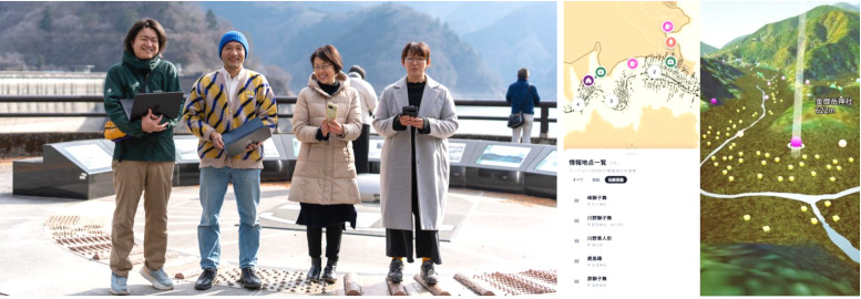 川野車人形保存会(河村良知代表)は2月27日、現在の奥多摩湖周辺の地図に旧小河内村の地図を重ねて表示するウェブマップアプリ「小河内タイムレンズ」を公開した。69年前に水没したふるさとの記憶を、町民の手でよみがえらせた。町制施行70周年記念事業として制作し、構成員の約8割を町民が占める有志チームが開発を担った。保存会を中心に移住者や若手世代も加わり、昨年8月から約半年かけて完成させた。アプリはスマートフォンのGPSやコンパス機能を活用。国土地理院の等高線データを基に制作した3Dモードでは、湖面に端末をかざすと現在地情報に応じて、かつて家々が建っていた場所や道筋が画面上に表示される |