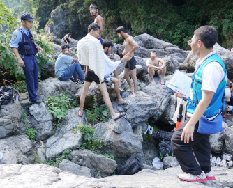 多摩川川下り事業者組合(青梅市御岳本町、後藤めぐみ会長)は15日、青梅警察署と連携し、同市内の多摩川河川敷でリバーパトロールを実施。組合事務局長の柴田大吾さん(48)、同署山岳救助隊、生活安全課など職員11人、テレビ番組の収録で訪れた元衆議でタレントの宮崎謙介さん(44)ら約20人が参加し、水辺の来訪者に安全確保とマナー向上を呼びかけた。同署との初の連携となった今回のパトロールは、「水辺の安全確保」「ごみの持ち帰り」「飲酒運転撲滅」の3点を重点的に周知した |