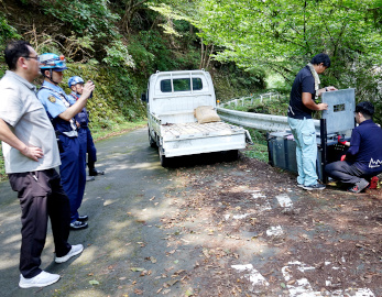 奥多摩町は8月14日、観光客による騒音や交通渋滞が大きな問題となっている鳩ノ巣渓谷(同町棚澤)で、青梅警察署と町内事業者と連携してマナー向上を呼びかけた。同渓谷内での実施は初めてで、同署協力による取り組みも初となった。同町が毎年お盆時期に実施する観光公害対策事業は今年で4年目。今回は騒音の苦情が多い鳩ノ巣渓谷を対象に選定。2024年の同時期には氷川渓谷でアジア系外国籍の2人が水難事故で死亡しており、崖からの飛び込みなどの危険行為や遊泳禁止の呼びかけも行った