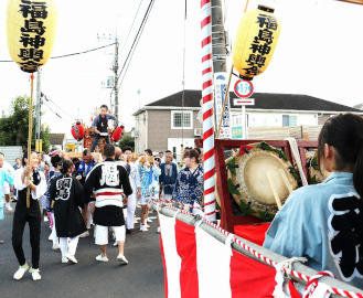 約500年前の創建といわれる昭島市の福島神社(福島町)祭礼が16・17日の両日行われ、神社神輿の町内巡行に際しては同神社の福島芝囃子保存会(安藤太一会長、会員25人)のお囃子が花を添えた