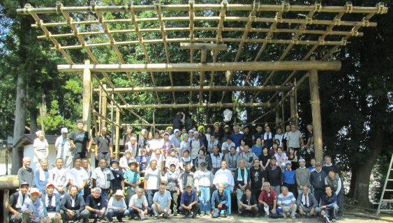 あきる野市二宮の武蔵国二宮神社で8日(月)と9日(火)、「生姜祭り」の通称で呼ばれる秋季例大祭が開催される。同祭は二宮神社氏子会を中心に町内会や商店街役員らが実行委員会を結成し、準備を進めている。8月23日、24日には総勢100人以上が朝から集まり、特設舞台の組み立て、例大祭の旗建て、花傘づくり、清掃などを行った |