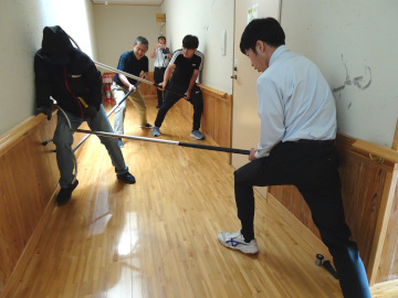 今年5月に立川市の小学校に男性2人が押し入り、教職員を殴るなどした事件を受け、日の出町教育委員会は8月25日、五日市警察署の協力を得て、不審者が侵入した場合の町立小中学校の合同防犯訓練を同町やまびこホールで行った。当日は、五日市警察から110番通報の仕方やさすまたの使い方の説明を受け、代表校の教職員3人でさすまたを使って不審者を確保し、警察に引き渡す実技訓練などを行った