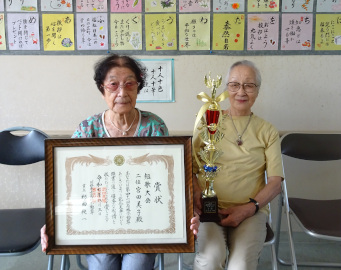日の出町大久野の宮田美子さん(95)は今夏、第41回高幡不動尊あじさいまつり記念大会の短歌大会で二位の成績をおさめ、高幡不動尊(杉田純一貫主)から賞状とトロフィーを贈られた。同町の大久野老人福祉センターで毎月2回寿書道の講師を務め、心に残る言葉などを毎日短冊に書く宮田さん。日野市の高幡不動尊にも毎年足を運び、短歌を応募してきた。過去に一位をおさめたことも。入賞作品は「あじさいの 根元は少し やわらかく 踏むをためらい たたずみている」 |