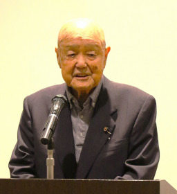 「多摩都市モノレール箱根ケ崎延伸決定記念」として、14日、元立川市長で一般社団法人多摩楽友協会会長の青木久さんが100歳を迎えて瑞穂町駒形富士山の郷土資料館けやき館で「わが人生100歳(百寿)を語る!」と題した講演会を行った。会場には田村利光都議はじめ山﨑栄町長など100人を超える関係者が詰めかけ、青木さんの百寿を祝った。主催は多摩楽友協会。瑞穂町や西多摩新聞社、多摩ケーブルネットワークなど10団体が後援した