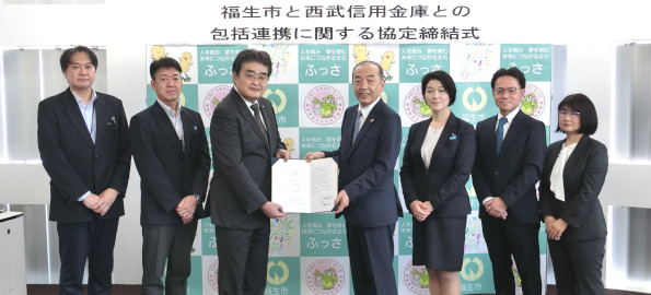 福生市と西武信用金庫(髙橋一朗理事長)は9月22日、同市役所で地域の活性化などを図るための包括連携協定を締結した。同金庫は都内5か所に発祥のルーツを持っており、福生市(当時の福生町)もその一つ。福生町の町長も務めた加藤一蔵氏が1948(昭和23)年に福生信用組合を発足し、武陽信用金庫に改組後、協立信用金庫と合併して西武信用金庫となった。現在も市の指定金融機関に指定されるなどの縁もあることから、地域の活性化や子育て、定住化等を図る目的で協定締結の運びとなった |