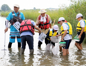 昭島市立田中小学校(星野典靖校長、児童数345人) は総合学習の一環として、このほど、クジラ公園近くの多摩川で4年生45人が小エビや魚を網で捕る「ガサガサや多摩川での水遊び」を体験した。協力・運営はあきしま水辺の楽校運営協議会(竹村茂己会長、会員40人)。