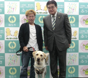 福生市在住の関章芳さん(51)は昨年12月、公益財団法人日本盲導犬協会から盲導犬エルマー(2歳11か月、オス、ラブラドールレトリーバー)を貸与され、福生市在住者では初となる盲導犬ユーザーとなった。関さんは7日、福生市役所を訪れ加藤育男市長を表敬訪問した。関さんは福生市出身。学生時代から強度の近視だったがスポーツなどに親しんだ。35歳のころ、勤務していた靴店で「茶色の見分けができなくなり、色むらや傷も分からなく」なり、障害者手帳の交付を受けて以後、徐々に視力が低下。現在は光の有無は判別できるが、目の前の人などは声の方向で確認している
