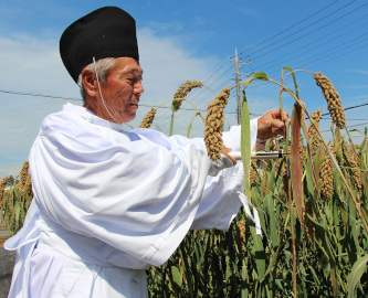 たわわに実った粟刈り取る