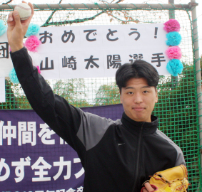 2025年プロ野球ドラフト会議で東京ヤクルトスワローズから3位指名を受けた青梅市出身の山崎太陽投手(22、創価大学4年)が11月23日、母校の市立第五小学校校庭(同市梅郷)を訪れ、幼少期を過ごした「吉野ベースボールクラブ」(柳原光雄代表)の関係者から祝福と激励を受けた。山崎投手は青梅五小、青梅西中出身。5歳から同クラブで野球を始めた。羽村リトルシニアを経て、愛媛県の帝京第五高校に進学。捕手として3年時には主将も務めたが、甲子園出場は叶わなかった。創価大に進み、佐藤康弘監督の勧めで1年夏から本格的に投手へ転向。最速149㌔のストレートを軸にスライダーやカーブ、カットボール、フォークを駆使する身長193㌢の大型右腕だ |