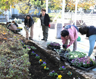 福生市の福祉センターの前庭周辺に河津桜の植樹などをして活動を続けてきた「河津桜の会せせらぎ」(小嶋早苗代表、会員12人)は15日、同センター前に葉の落ち葉を掃きパンジーなど花々を植えて20年間にわたる植樹・植栽の活動に幕を下ろした。同会では福祉センターの前庭が殺風景で寂しかったことから年社会福祉協議会に公園ボランティアとして登録。2005(平成17)年に草むしりをして肥料を施し土壌を耕すなどしてアジサイ、チューリップなどの花々を植栽する一方、河津桜の苗木20本を庭や建物周辺に植樹、それらを市に寄付した。それから20年、大木に育った河津桜は2月下旬から6月にかけて満開となり多くの人が観賞に訪れるという |
