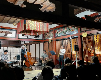 あきる野市横沢の「金色山吉祥院大悲願寺」(加藤章雄住職)で、このほど「お寺で音楽を聴く集い実行委員会」(栗原一雄実行委員長)主催の「お寺で聴くジャズとコンテンポラリーピアノ音楽の夕べ」が開催され、100人以上が訪れた。「お寺で音楽を聴く集い」は、30年ほど前、栗原実行委員長と加藤住職が「地域の人たちが身近な場所で一流の音楽を聴ける場を」と話し合い、加藤住職からの提案で都指定文化財である本堂での鑑賞会が実現。実行委員らがパンフレットやチケットを作り友人などを誘う鑑賞会として続いている。今まではクラシックが多かったが、今回はジャズ好きの加藤住職の提案でジャズの夕べとなった |