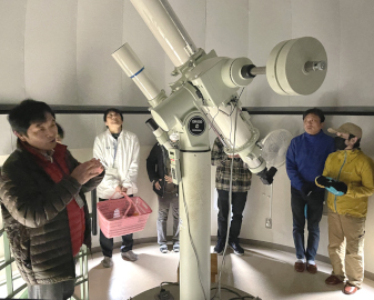 あきる野市の都立五日市高校(松﨑真理子校長)で11月22日、天文観望会が開かれ、市立五日市中学校の生徒や保護者、教員ら約20人が参加。校内にある天文台の天体望遠鏡を使って土星や海王星などを観察した。この天体観望会は、同校定時制が天文台を活用した「五日市中学校・五日市高校連携授業」として、数年前から実施しているもの。ドーム内に設置されている望遠鏡は、口径15㌢と7・5㍍のフローライトレンズを使用した国内有数の屈折望遠鏡という |