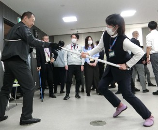 瑞穂町は11月26日、福生警察の協力で、瑞穂町役場庁舎1階窓口フロアで職員の自主研修として「さすまた」を使った防犯訓練を行った。町住民課、税務課、福祉課、子育て応援課、高齢者福祉課、会計課の職員ら60人が参加した。訓練は職員の防犯意識と対応力の向上を目的に、町福祉部と住民部が呼びかけて実施。吉野久住民部長は「平成27年の11月30日に稲城市の税務課のカウンターで放火が起きたとき、当時の担当課長は頭が真っ白になったと話した。瑞穂町では2014(平成26)年に不審者対策として窓口を所管する5つの部署にさすまたを設置し、訓練をしたことがあるが、10年が経つ。職員の異動や新庁舎への移転もあり、訓練を経験していない職員も増えた」とし、「いざという時に少しでも動けるように訓練を行うことにした」と話した |