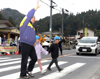 青梅市成木の成木保育園(川窪公夫園長、園児74人)で園児が横断歩道で事故に遭わないように青梅警察署(末次健次署長)の協力を得て3日、同園前の成木街道沿いで交通教室を開いた。成木街道は砕石用のダンプカーなど大型車や一般車両の通行量が多い街道。園の前の横断歩道には信号機がない。このため園児に渡る時の注意点などを教え事故防止を図ることになった。当日は薫田亨交通課長以下、署員9人と白バイ・パトカー各1台、ピーポくんも登場し園児の注目を集めた |