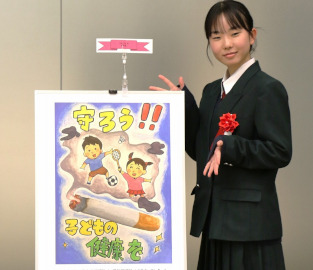東京都の「令和7年度20歳未満喫煙防止・受動喫煙防止ポスターコンクール」で、あきる野市立御堂中学校(多田春美校長、生徒数192人)の3年生、堺麻央さん(15)が中学の部で502点の応募の中から5人の優秀賞の一人に選ばれ、11月25日、都庁で表彰式が行われた。同コンクールではこれまで西多摩地域で小学生が3人、中学生が一人選ばれており、いずれもあきる野市の小中学校児童・生徒。堺さんは2014(平成26)年に市立秋多中生徒が受賞して以来11年ぶり、二人目の受賞者となった。当日、入賞者には都保健医療局技監の成田友代さんから小池百合子知事名の表彰状が、同局保健政策部長の小竹桃子さんからは図書券の副賞が贈られた |