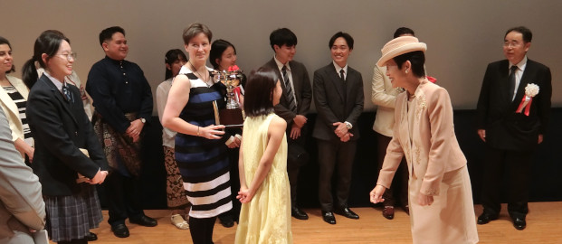 世界の人々が日本語で意見を発表する「第64回外国人による日本語弁論大会」が12月6日、昭島市のFOSTERホール(市民会館)大ホールで開催された。高円宮妃久子殿下がご臨席され、発表した人たちを激励された。特別審査員をモデルで女優のトラウデン直美さんが務めるなどして大会を盛り上げた。スピーチコンテストには全国から予選を通過した12人が出場し、外務大臣賞には「招かれざる客」をテーマに発表したネパール出身の会社員ケーシー・アミトさんが選ばれた |
