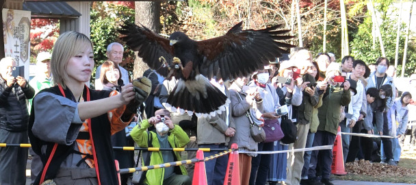 瑞穂町郷土資料館けやき館前の広場で11月29日、同町に住むNPO法人「日本鷹匠協会」会長の尾作文男さん(71)と府中市在住で同会副会長の村野貞夫さん(79)らの鷹匠がオオタカを腕から放って飛翔させる催しが行われ、貴重な伝統技能を一目見ようと約140人が集まった。瑞穂町は江戸時代には尾張藩の鷹場の一部であった歴史がある。同館では鷹を調教する道具、鷹狩りをする鷹匠の活動が分かるミニ展示も行われた |