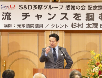 S&Dホールディングス(田村勝彦社長)は2月5日、京王プラザ八王子(八王子市)で感謝の会を開催。多摩地域の取引業者156社211人が参加した。冒頭、田村社長は「グループの起源である交運社とともに創業の精神である『誠実努力』の企業理念を継承しながら地域に役立つことを追求して今日に至っている」とし、「昨年は保険業務を専門とするS&Dフィナンシャルサービス社、マクドナルド事業を展開するS&Dヒューマンウェア社を展開するに至った。今後とも皆さまの協力のもとに社業に精進していきたい」とあいさつ。 記念講演会ではタレントで元参議院議員の杉村太蔵さんが登壇。清掃会社の社員から26歳という若さで議員となり、初談話での「料亭に行きたい」が世間の話題となり、幹事長から注意を受けた当時の様子などを披露した